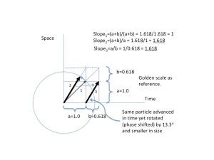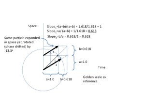 At a critical point, which should correlate to the end of one holomorphic cycle, the slope of the vector and the slope of the phasor are equal (which happens to be equal to the Golden Ratio as shown in the figure below), so to an observer, the two look identical to each other but slightly rotated with respect to the original. Rotating the reference frame to line the vector back up with the diagonal (where the speed of light is constant) results in what appears as spin. The same process happens simultaneously with the other phasor, rotating to the right. The reference point on the space axis (the infinitesimal circle at the origin of the plot) also expands and the base of the vector moves up on the space axis (outward in space).
